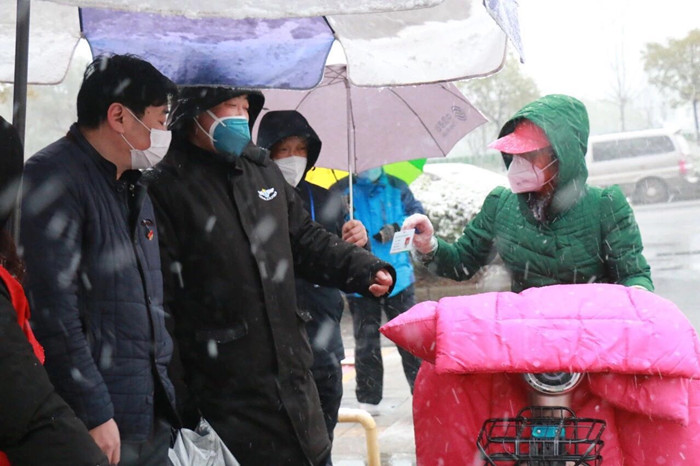 孫霖同志冒著風雪守在小區門口
