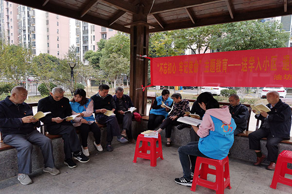 社區支部有一些老黨員,因為年歲已高,眼睛已經看不清書中的字,卻依舊想要學習黨的先進思想。為此,社區以老少黨員圍讀的方式,給老黨員們送學。老少黨員們圍坐在亭子中,新老黨員配對搭檔。老黨員人生閱歷豐富,黨性修養高且工作態度積極;年輕黨員缺少工作實踐經驗,但文化教育程度普遍較高。年輕黨員讀完書中內容后,大家開始就書中內容交流探討,思想與思想碰撞間,每個人都受益匪淺。