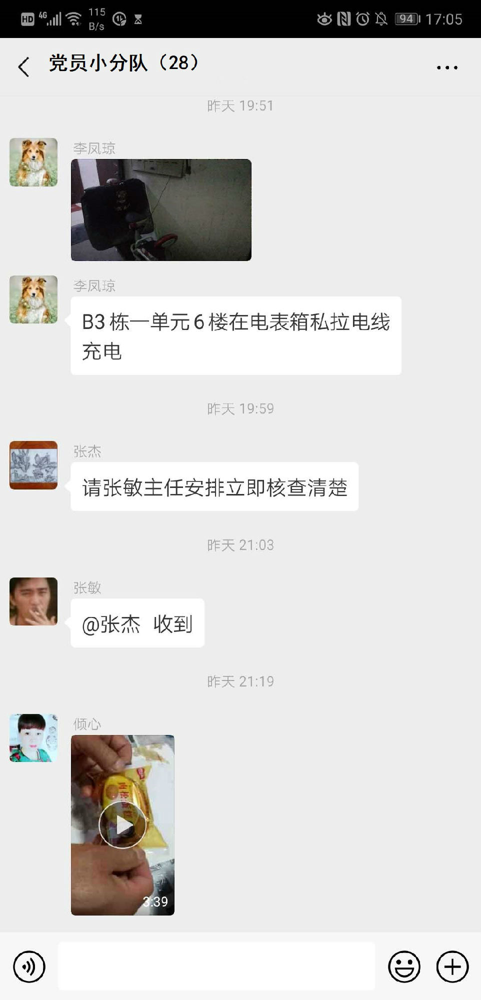 “B3棟一單元6樓有人在電表箱私拉電線給電瓶車充電”,“漁樵后廚店面外下水道滿溢”,“活動中心男廁所漏水”,“宿松路和紫竹苑小區交口(紫竹苑小區石頭西)有不少單車(兩處)倒在地上”……隨著手機微信發出的“嘀嘀嘀”聲,社區群眾生活中存在的小小安全隱患信息像接力火炬一樣被一一傳遞,更被一一解決,有黨員小分隊在的日子,每一天都是晴天。