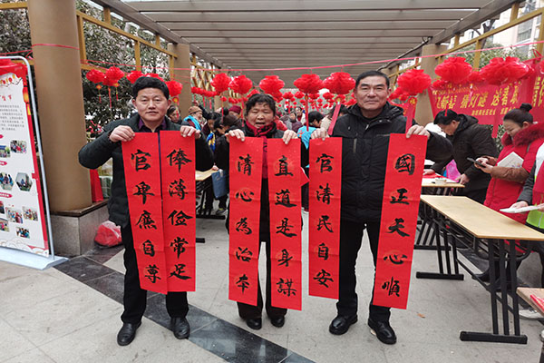 活動現場,社區老黨員、志愿者們裁好紅紙,備好筆墨,揮毫潑墨,一副副蘊含廉政文化內涵的春聯躍然紙上。隨后,老黨員們將寫好的一幅幅春聯送到居民手中,以“廉潔”為主題的春聯,更是把廉潔清風吹進千家萬戶。