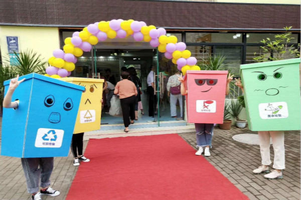 生動形象的四位扮演垃圾桶教師,帶著親切的問候與每一位家長孩子打招呼,班級教師詳細介紹了垃圾分類的標志,如可回收垃圾、不可回收垃圾、廚余垃圾等,垃圾的品種及如何進行垃圾分類。小朋友們認真聽講、積極思考,增長了垃圾分類知識。同時,在戶外活動時垃圾桶扮演者與我們小朋友進行友好互動,在環保教育活動中,孩子玩玩中學學中玩,收益很大。