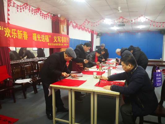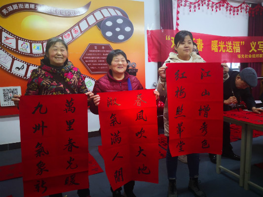 1月13日,曙光社區社會組織聯合會黨支部、曙光書畫協會分別在社區綜合文化活動中心、創景花園開展“歡樂新春、曙光送?!绷x寫春聯活動?;顒蝇F場人頭攢動、熱鬧非凡,活動室里聚滿了等待的居民,曙光書畫協會的書法家們揮毫潑墨,將一幅幅寓意喜慶吉祥的對聯送到居民們的手中。
