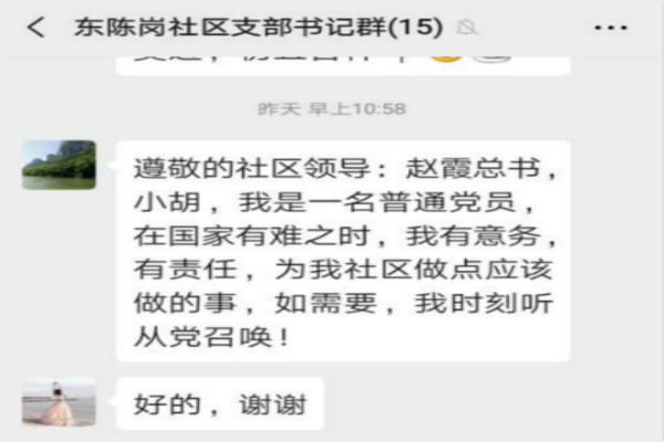 “尊敬的社區領導,我是一名普通黨員,在國家有難之時,我有義務、有責任,為社區做點應該做的事,如需要,我時刻聽從黨的召喚!”這名主動請戰的黨員叫呂保民,今年64歲,是東陳崗社區的一名退管支部書記。疫情防控狙擊戰打響以來,他不畏險阻,主動請纓,要求加入到聯防聯控行動中,現在他成為了社區的防疫宣傳志愿者,帶頭宣傳疫情防控知識。