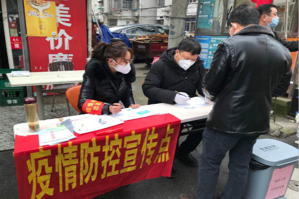 2月9日,望江東路社區(qū)年輕的黨員志愿者溫莉和方夕予在小區(qū)門口進行疫情防控宣傳服務工作。