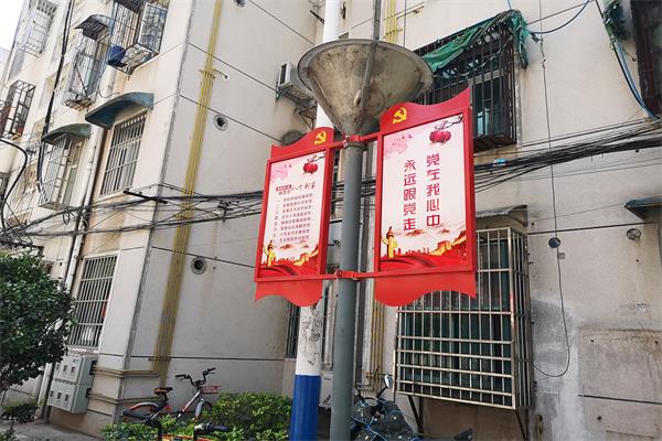 美湖社區黨支部在小區主要干道懸掛燈桿旗,樓棟黨小組的常態化八個到家讓更多的人知道并加入進來