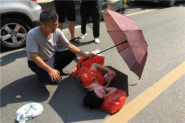 由于當時氣溫高,戶外居民較少,周圍僅有一群老人,看到此情況老人們都慌了神。有一位老人上前準備將女子扶起來,這時在轄區巡查的寧國新村社區黨委書記立即制止,上前觀察女子情況,隨即詢問路過行人是否撥打了120,確保能得到及時救治,并聯系社區工作人員前來幫忙,通過女子隨身證件,社區迅速聯系到女子家人。在等待救護車和女子家人的時候,寧國新村社區黨委書記細心地蹲在地上為該女子撐起傘,避免太陽暴曬,造成傷害,直到救護車到達現場。該女子家人隨即也到達了,并表達了對社區黨委書記的感謝,經過檢查中暑現象明顯,頭部傷口還需做進一步檢查,直到救護車開走,該女子仍未清醒。