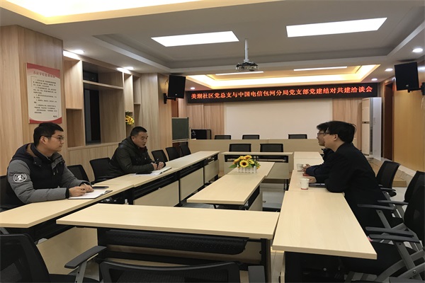 洽談會(huì)上首先美湖社區(qū)黨總支張書記對電信包河分局來社區(qū)黨建合作表示歡迎,并簡要介紹了社區(qū)的基本情況。隨后,電信包河分局黨支部書記就目前黨支部情況做了介紹說明并結(jié)合自身行業(yè)特點(diǎn)對未來黨建活動(dòng)提出建議,對2020年主題黨日就5G通信展示廳、基站參觀、通信科普等活動(dòng)發(fā)出邀請,并希望在結(jié)對共建征程中,能將黨的政治優(yōu)勢更好的轉(zhuǎn)化為發(fā)展優(yōu)勢,轉(zhuǎn)化為服務(wù)群眾的實(shí)際行動(dòng)。