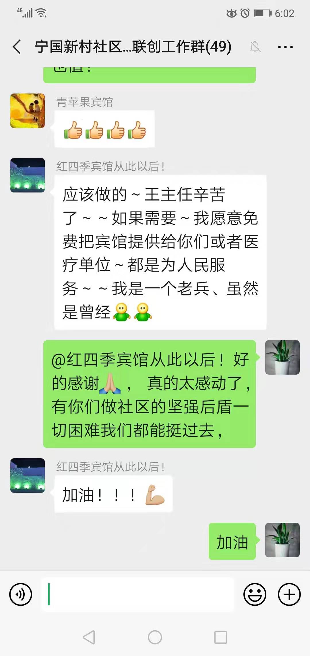 轄區(qū)商戶眼中,她是權(quán)威的管理員。疫情防控工作開展以來,賓館商戶是排查的重點(diǎn)部位,王主任每天奔走在各家商戶之間,檢查督促他們做好員工管理工作,定時(shí)進(jìn)行室內(nèi)消毒,也會及時(shí)了解酒店入住人員情況,確保沒有湖北籍旅客入住。她將所有商家負(fù)責(zé)人拉入微信群中,方便大家交流,開展聯(lián)防聯(lián)控,保證了轄區(qū)防控形勢的穩(wěn)定。正是這樣認(rèn)真負(fù)責(zé)的態(tài)度,感動了商戶,轄區(qū)紅四季賓館就在群里明確表態(tài),如果社區(qū)和醫(yī)療單位需要,他愿意免費(fèi)拿出賓館給工作人員使用;轄區(qū)天貓超市也為社區(qū)捐贈時(shí)令蔬菜820斤;轄區(qū)新月光茶樓和物業(yè)管理公司為一線工作人員捐贈了400個(gè)口罩。