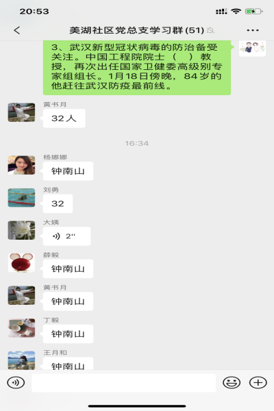 “第三題,請聽題:武漢新型冠狀病毒的防治備受關注。中國工程院院士( )教授,再次出任國家衛健委高級別專家組組長。1月18日傍晚,84歲的他趕往武漢防疫最前線。”“鐘南山鐘南山鐘南山……”美湖社區黨總支學習群被社區黨員的答案刷屏了。