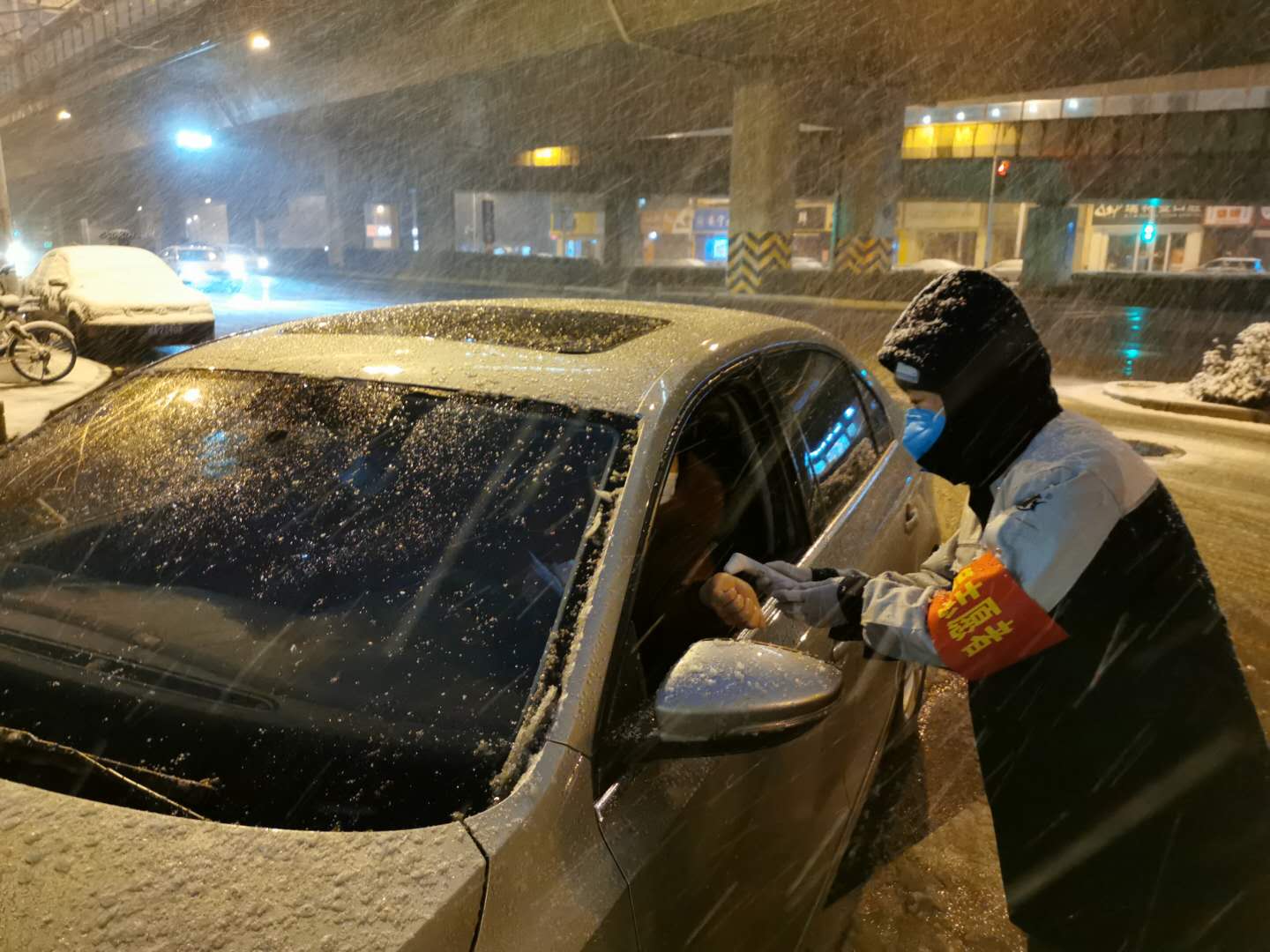 場景一:2月16日晚,大雪,各個值守點的志愿者們無一缺勤,堅持冒雪工作,對往來小區人員登記、問詢、測量體溫,嚴格查驗出入證、復工證明等證件是否齊全,對不符合進出小區的人員進行勸退、勸返,鞏固社區、安保等工作人員一整天的工作成果……除此以外,他們還奮力鏟雪,為小區門口和周邊鏟出一條條便于行走的“安全通道”。
