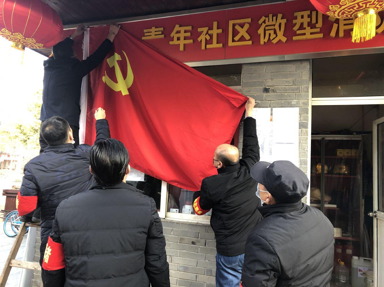 場景二:2月16日晚,因雪大風大,青年小區東區黨員先鋒崗懸掛的黨旗一角被大風吹松了,該值守點唐麗霞、王祥兩位同志和安保人員一起,扶梯、登梯,調整黨旗的位置,維護了黨旗的尊嚴。