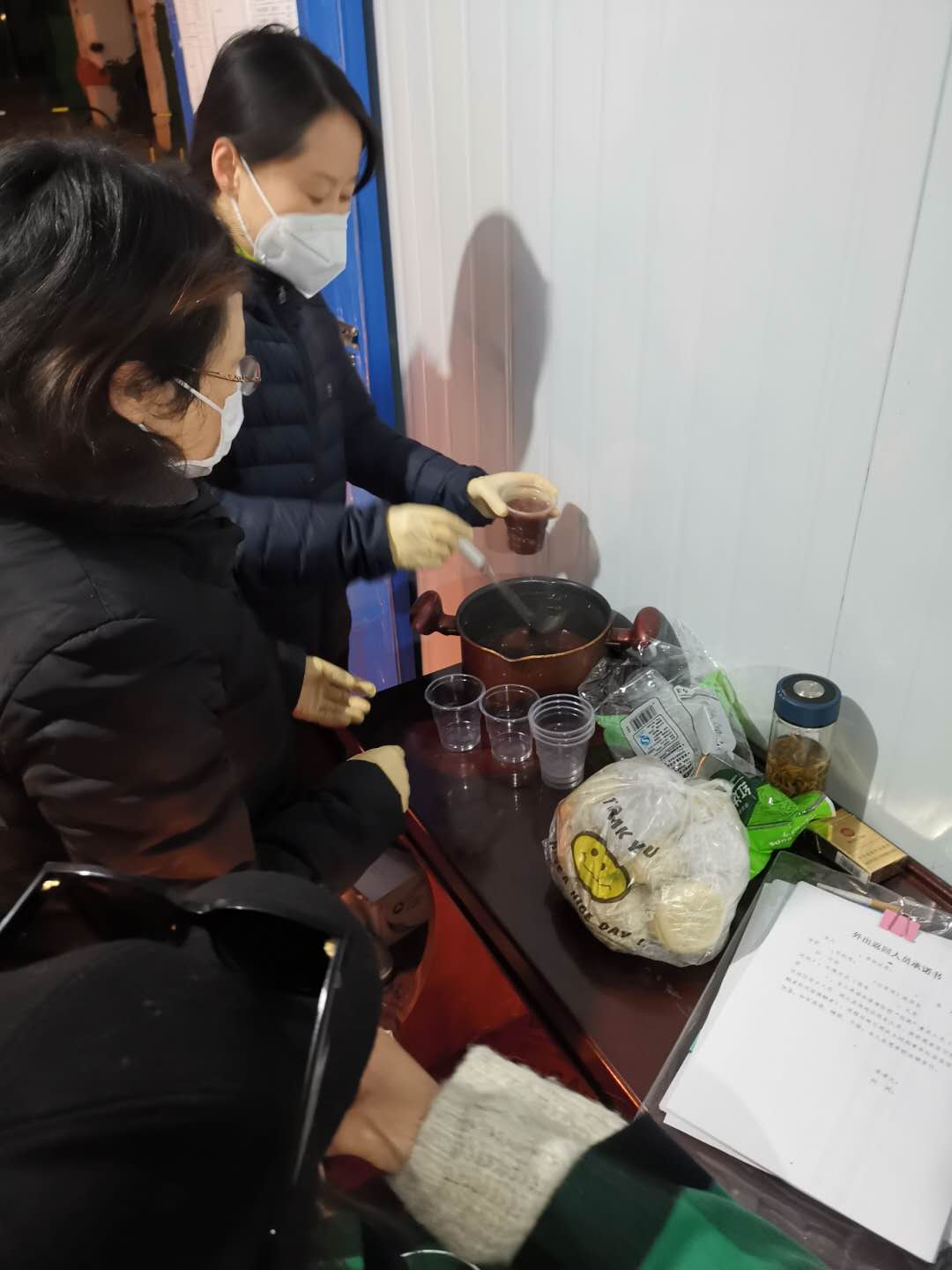 場景四:2月16日、17日,連續兩晚,世紀陽光花園金陽苑、青陽苑幾位業主自發為志愿者們送來了熱騰騰的酒釀、稀飯、包子,還有口罩,讓志愿者們無比感動,在“臨時支部黨員群”里分享了照片,群里的志愿者們感同身受,一致感到參與這樣的志愿工作非常有意義。