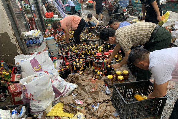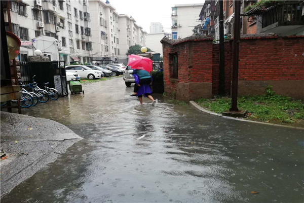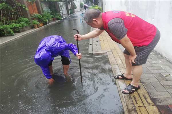 在寧國路菜市場底下倉庫排水中,社區黨員同志幫居民搶險運出20萬左右的物資,確保了居民的財產安全。