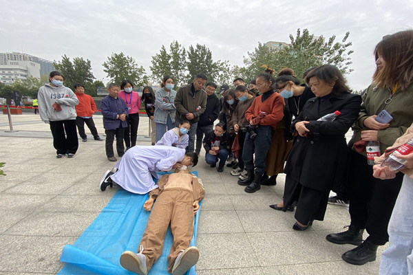 接著,救護警戒組模擬救援場景。醫療救援組用擔架把傷者抬到安全區域,在包公街道衛生服務中心醫護人員認真詳細的講解中,樓宇企業黨員、群眾全神貫注地聆聽,并在醫護人員的指導下親自演練心肺復蘇、人工呼吸的急救“黃金四分鐘”。