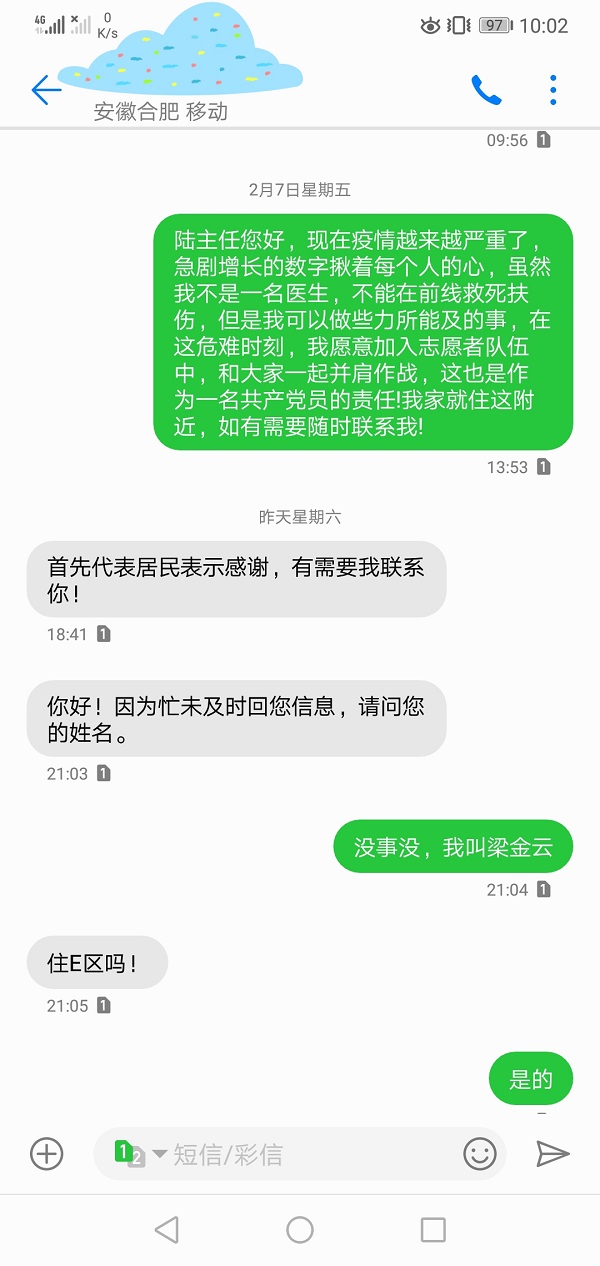 “陸主任您好,現在疫情越來越嚴重了,急劇增長的數字揪著每個人的心,雖然我不是一名醫生,不能在前線救死扶傷,但我可以做些力所能及的事,在危難時刻,我愿意加入志愿者隊伍中,和大家一起并肩作戰,這也是作為一名黨員的責任!我家就住在這附近,如有需要隨時聯系我!”2月8日,駱崗街道包河花園社區E區網格負責人陸厚青收到了一條短信。這條短信來自于家住在包河花園小區的95后女孩梁金云。