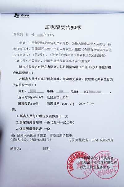這是2月12日早晨發生在駱崗街道陽光里小區的一幕。近期有不少從外地返回合肥復工的人員,按規定他們需要自行居家隔離觀察。針對這些居民,陸大村聯合湖濱物業制作并贈送“暖心禮包”,包括一支水銀溫度計,一份《體溫測量登記表》和一份《居家隔離告知書》。居家隔離告知書上寫明了該戶居民需要隔離觀察的起止日期、注意事項,以及陸大村和物業的聯系方式,方便居民隨時尋求幫助。陸大村已采購了178支溫度計,用于自行居家觀察人員自己測量體溫使用。志愿者們也會每日與其聯系,及時掌握其身體狀況。