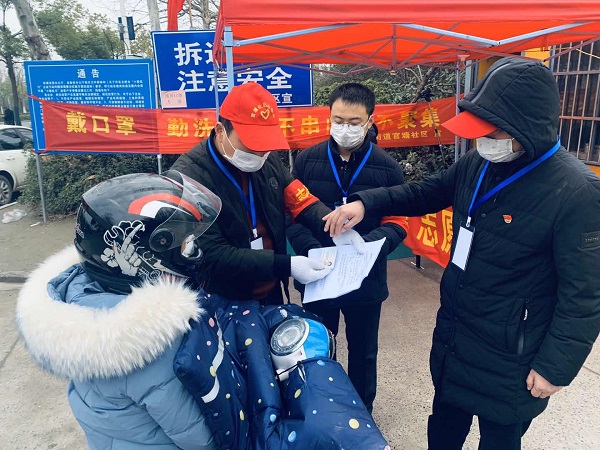 志愿者參與小區(qū)門崗值守,核實出入證明,檢測體溫