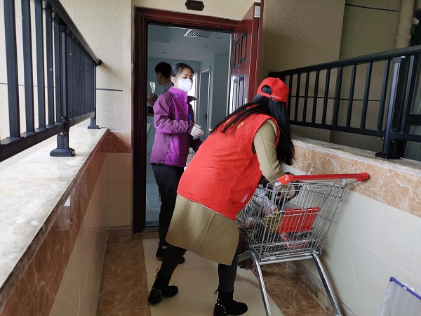 黨員志愿者與物業(yè)工作人員給居家隔離人員送生活物資
