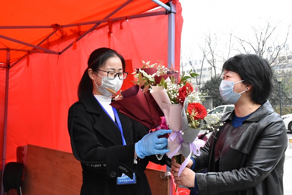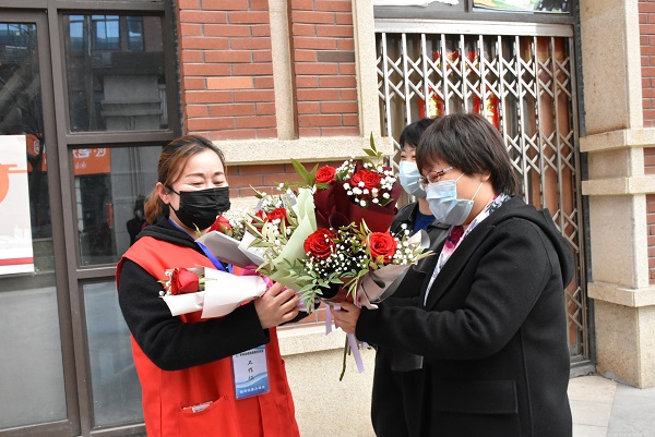 在第110個“三八”國際婦女節來臨之際,駱崗街道提前策劃,定制了最美的鮮花,送給最美的她們。“在疫情防控阻擊戰中,感謝大家始終堅守一線,今天是我們‘女神’們的節日,在此借助鮮花祝愿大家節日快樂!工作中一定要做好自我防護……”3月8日上午,駱崗街道黨工委副書記張旭梅、黨建辦負責人王琪、婦聯副主席徐琴一行人將一束束鮮花送給堅守在一線的巾幗戰疫者們,向她們不怕困難、堅守崗位、舍小家為大家的精神致以崇高的敬意。