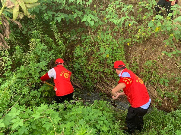 高王社區“黨員河長”清理樹田中的水渠,防止內澇