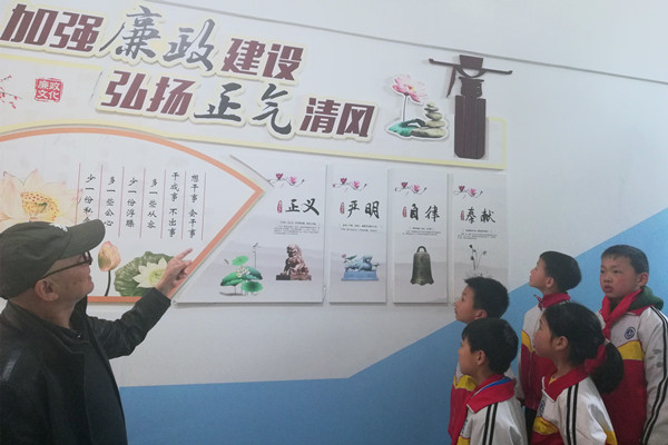 在社區廉政文化墻下,老黨員王家安結合安徽名人包拯不收受賄賂抓捕貪贓枉法國舅、拒絕皇帝賞賜的廬州城,只收一段淤塞已久的護城河等故事給孩子們闡述了正義、嚴明、自律及奉獻的清廉文化內涵,教導大家要做個正義之人、自律之人,用實際行動踐行社會主義核心價值觀。