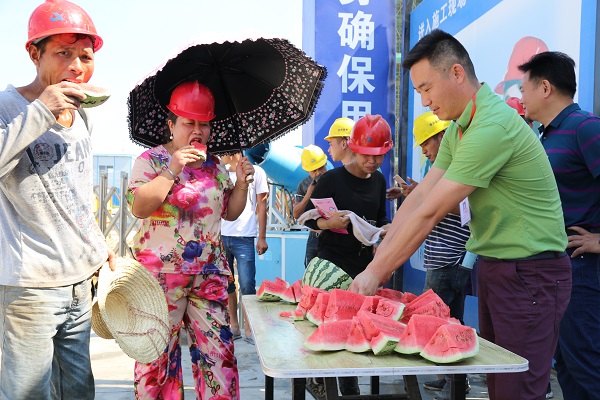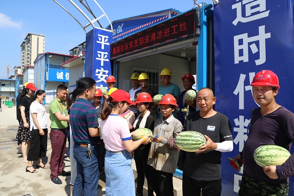 活動現場,順園社區黨支部來到轄區工地施工現場和戶外作業場所,與工友們進行交流,詢問高溫工作防暑措施。將西瓜、人丹、十滴水等防暑降溫物品送到他們手中,囑咐一線工人要提高自我保護意識,注意施工安全,合理安排工作時間,盡量避免高溫時段作業。現場一線工作人員管師傅表示,在強烈的陽光照射下,雖然感到悶熱難受,卻能感受到社區黨支部送來的清涼和關懷。