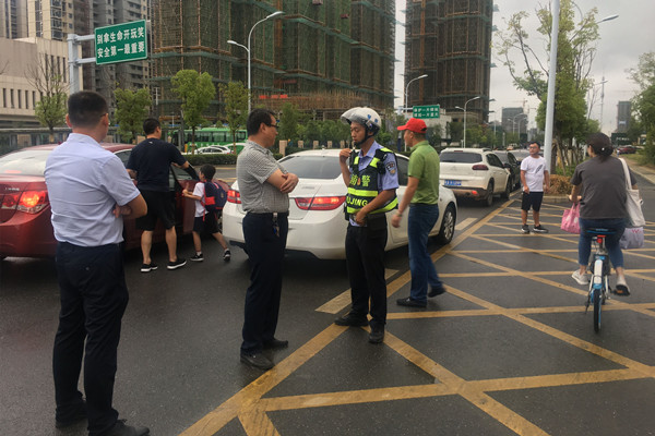 上午8時天空突降大雨,學校附近車流量與人流量暴增,給學生通過馬路進入校園造成了安全隱患。社區黨員志愿者和五老護學志愿者們積極行動,冒雨在幼兒園及小學門口開展交通疏導,引導學生家長文明有序的進入學校,城管和交警部門引導家長的車輛沿道路有序停放,使交通工作井然有序。