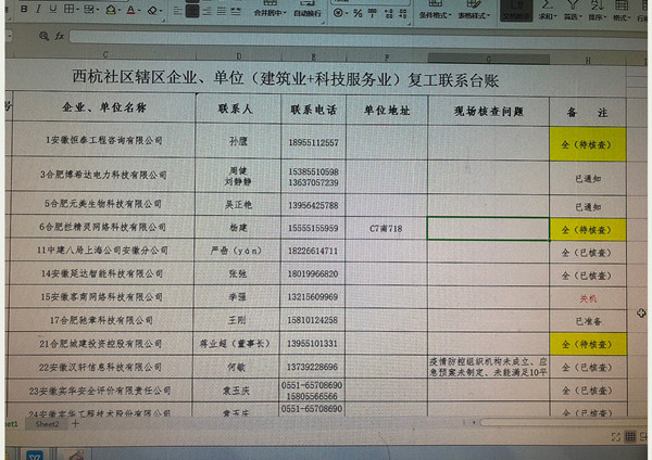 加強材料初審,建立臺賬嚴把關。面對轄區企業復工報備申請材料多、材料不全、填表不規范、急等上報等問題,包河區煙墩街道西杭社區黨支部努力克服時間緊、人員缺、任務重困難,緊急抽調3名社區工作人員,專職、專項負責企業復工報備申請材料初審工作。截至目前,黨支部共接收復工報備申請材料131家,其中,材料齊全、待核查25家,材料不規范、待完善25家。為了列清每家企業復工報備申請材料提交日期、辦公地址、疫情防控負責人及聯系方式、材料準備進度等重要信息,西杭社區黨支部建立《煙墩街道西杭社區轄區單位、企業復工聯系臺賬》,及時跟進、嚴格把關企業復工報備申請材料完備情況,為后續聯動相關部門現場核查、防疫跟蹤提供便利、依據。