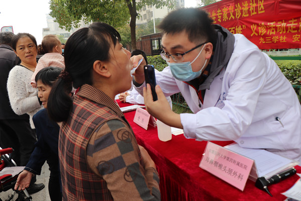 活動現場,來自安徽醫科大學第四附屬醫院消化內科、內分泌科、腎內科、普外科、骨科、婦科、耳鼻喉科、心內科等科室的專家們耐心地為居民們進行義診,詳細了解病情,查看病癥,提出治療方案。針對病情復雜的居民,專家們詳細查看病歷和各項檢查報告單,給出就醫的指南,為居民解除了困惑,從而科學高效就醫。此外,現場還為居民提供測量血壓和血糖服務,專家們對多發病、慢性病進行初步篩查,講解常見病防治方法,指導居民合理用藥、日常預防。此次義診持續近兩個半小時,服務居民200余人次,受到居民的一致好評。“在家門口就能看到很難掛到號的專家門診,真的太方便了,我特地把家里面的口服藥、片子都帶過來了,張主任和我講了很多注意事項,我都一一記下了,收獲很大,真的太感謝了!”家住濱湖欣園小區的朱廣鳳老人這樣說道。