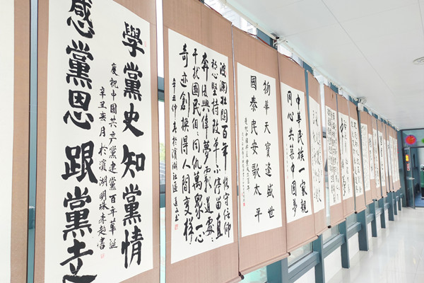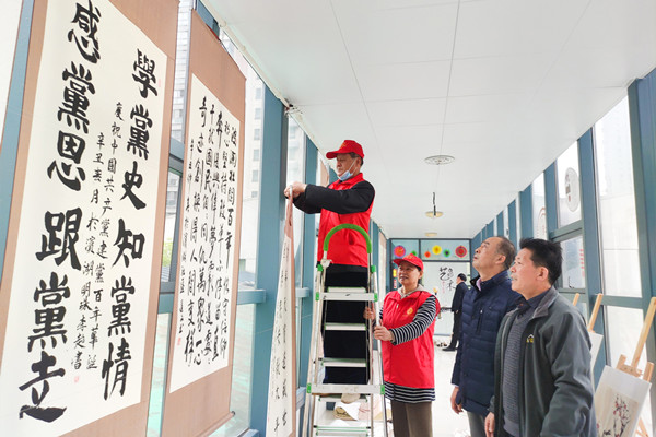 4月2日上午,社區黨群攜手傾情打造的“黨史”文化藝術長廊,正式閃亮“上線”。來自濱湖明珠社區老年學校的幾名黨員先鋒、居民骨干將裝裱后的書法作品,仔細展開、認真懸掛、精心整理,不僅“黨味”十足,也增添許多“雅韻”。據社區老年學校負責人胡勤勤介紹,社區黨委發起活動倡議后,黨員群眾紛紛踴躍報名,王正泉、高玉龍等12位居民,用了10多天的時間,最終創作出32副“黨史”主題書法作品,其中既有經典紅色作品,也包括自行創作的。