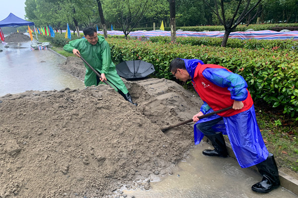 “現在雨下的太大,路邊的下水管道被沙堆覆蓋了,積水嚴重,我們現在就鏟出一個通道。”萬年埠街道云華社區黨總支副書記孟磊一馬當先沖到了雨中鏟沙堆、通積水。