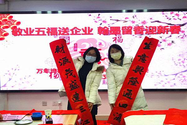 書寫春聯(lián),愛國(guó)敬業(yè)畫“福”字。書法老師們?cè)诩t紙上揮毫潑墨,行、草等多種古典書法各顯神韻,一幅幅散發(fā)清新墨香的美好祝福躍然紙上。此外,書法老師還提供“個(gè)性化定制”服務(wù),樓宇員工們將事先準(zhǔn)備好的內(nèi)容交給書法老師現(xiàn)場(chǎng)定制,如“生意興隆通四海,財(cái)源茂盛達(dá)三江”“財(cái)運(yùn)亨通五福臨,心想事成百業(yè)興”等祝福語(yǔ),希望來(lái)年風(fēng)調(diào)雨順、生意興隆。美設(shè)物流小哥贊許道:“書法老師手寫的春聯(lián)好看又大氣,領(lǐng)到了春聯(lián)和福字,今年又是美滿的一年。