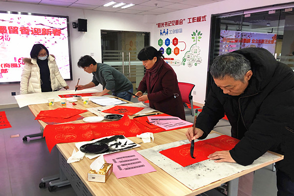 春節(jié)臨近,為豐富樓宇員工文化生活,迎接新春佳節(jié),2月3日上午,萬(wàn)年埠街道未來(lái)塔樓宇(商圈)黨委聯(lián)合實(shí)創(chuàng)公益黨支部,共同開展”樓宇寫春聯(lián),五福送企業(yè)”主題活動(dòng)。活動(dòng)現(xiàn)場(chǎng),邀請(qǐng)多位書法老師現(xiàn)場(chǎng)寫春聯(lián)、畫“福”字,樓宇員工參與“集五福”,感受傳統(tǒng)文化魅力。