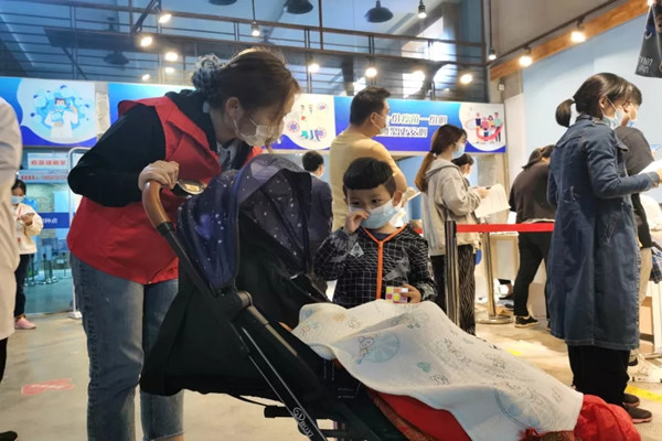 5月15日上午,志愿者毛毛正在朱崗后街接種點疏導接種隊伍,眼尖的她在擁擠的人群中發現了一個特別的身影:一位年輕的女士一手牽著一個三歲小男孩,一手推著一個嬰兒車。原來,這位女士家中沒有幫手,她將兩個孩子都帶到了接種點。了解情況后,毛毛熱情地向其介紹現場的便民服務,并主動幫忙照顧孩子。在媽媽排隊等候接種的過程中,毛毛親切的陪孩子們聊天,給他們講故事,還貼心地買來了牛奶、面包、糖果等,安撫他們不安的情緒。順利接種完疫苗回到等待區,這位女士看到孩子跟毛毛開心地玩耍,她激動地說:“要不是你們幫忙照看,我不可能這么順利完成疫苗接種。太感謝啦!”