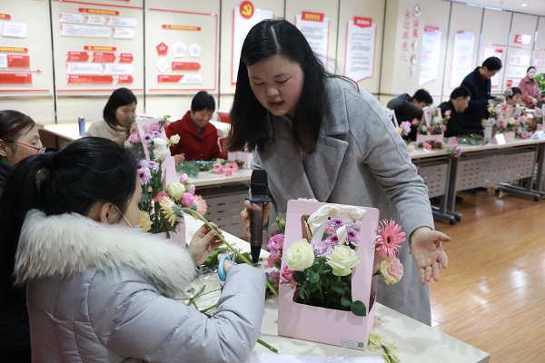 隨后,專業花藝師現場教學30名“三工”婦女代表制作韓式手提花盒,并給予專業點評,學員均表示受益匪淺。教學結束后,黨工委領導攜社工和義工婦女代表,將提前準備的50支玫瑰花贈與各個活動室的居民,并送去節日的慰問。