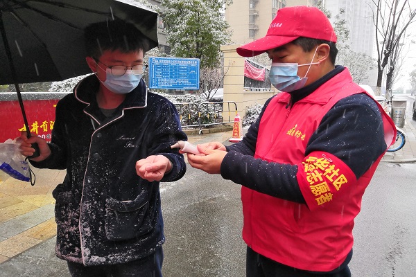 “如有戰,召必回,退伍軍人來報到,組織哪里需要就把我放哪里。”疫情發生后,云華社區居民黨員、退伍軍人葛浩兵第一時間來到社區申請參加志愿服務。同時還送來了8個噴壺和100個口罩。“這位大哥,疫情嚴重,小區實行封閉管理,返程人員需要在這邊登記信息。”風雪中,葛浩兵依然堅守在小區出入口,進行測體溫、發放通行證、返程人員登記等工作。他說:“作為一名退伍軍人,關鍵時刻我就應該站出來沖到第一線,這是我的使命也是我的責任。”