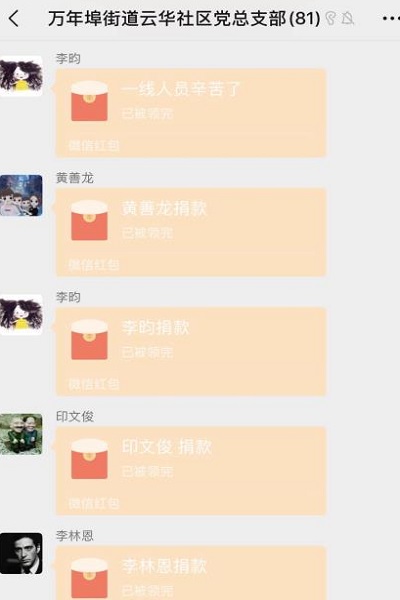 看到黨支部在微信群中發(fā)布的捐款號召后,云華社區(qū)居民黨員張道蘭第一時間響應。“全國人民都在全力抗擊新冠肺炎疫情,很多一線工作者奮戰(zhàn)在抗疫一線,非常辛苦,我心里很著急,我是一名黨員,只能通過黨組織繳納1000元黨費。這是我的一片心意,希望能為疫情防控提供一點幫助,請組織接收。”張道蘭說。張道蘭是一名退休黨員,生活中樂觀積極,熱心公益,現(xiàn)為臨湖苑20#樓棟黨小組長,在紅色領(lǐng)航和美小區(qū)建設(shè)中,發(fā)揮黨員模范帶頭作用,為社區(qū)治理建設(shè)獻言獻策,參與志愿服務(wù)等。疫情當前,張道蘭更是全身心投入到志愿服務(wù),后期因腰部不適還堅持帶病上崗,經(jīng)社區(qū)領(lǐng)導多次勸退才回家休息。張道蘭用一言一行,向我們展示了一位老黨員踏實肯干的作風和對初心使命的堅守,為我們上了一堂意義非凡的生動黨課。萬慈社區(qū)親湖苑居民黨員劉光倫也是如此,積極捐款500元。轄區(qū)內(nèi)像這樣的老黨員還有很多。