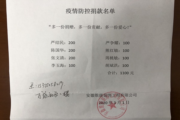 轄區(qū)企業(yè)安徽維康裝飾工程有限公司向萬慈社區(qū)黨支部捐款1100元。“這是我們公司黨員自發(fā)組織的捐款,希望能幫助到抗疫一線的工作人員,”企業(yè)黨員嚴爭耀說。“我也是一名有十多年黨齡的老黨員了,無論我在哪,在什么崗位上,國家有難,我必要出一份力。”萬象美物業(yè)企業(yè)黨支部書記張澤將也捐款2000元,意在支持抗疫工作。