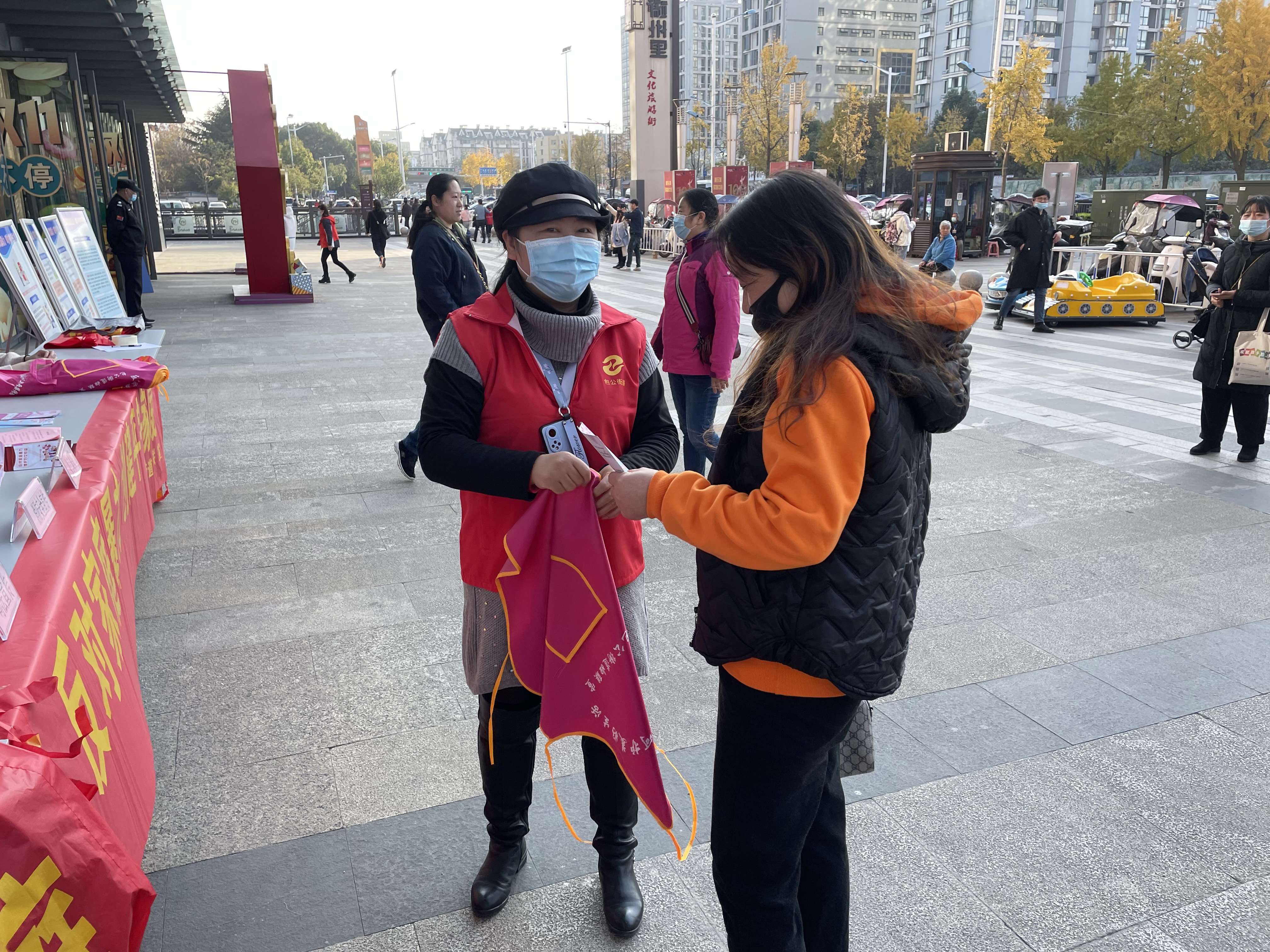 活動現場,志愿者們向居民發放了反家庭暴力宣傳冊和圍裙,并圍繞“什么是家庭暴力、如何防止家庭暴力”等問題,向居民介紹了家庭暴力的表現形式、危害,以及遭遇家庭暴力后自救的方法和途徑。