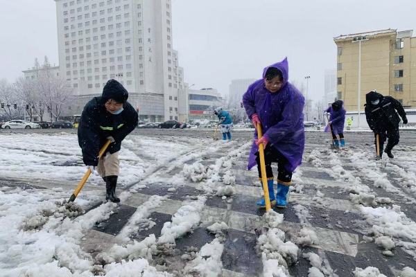 天氣寒冷,小雪仍在紛飛,惡劣的天氣情況卻阻擋不了黨員志愿者內心為民做實事的熱情。兩家單位的支部書記率先垂范、奮勇出擊,迅速吹響除雪“沖鋒號”。大家拿著鐵鍬、鐵鏟走上街頭,不畏嚴寒、精神飽滿、分工明確的身影成為了街上最亮麗的風景線。“太辛苦你們了,為我們人民群眾做好事,這下不用擔心雪天路滑了!”路過居民感激地說道。