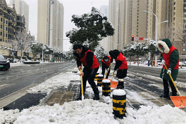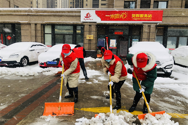 冷冽的寒風吹不滅大家鏟雪的熱情,身上的紅色志愿馬甲成為溫暖冰雪的力量。大家在寒冷的環境中,團結一致、不畏嚴寒的忙碌于轄區重點路段、各小區出入口、商場等地,清理出一條條便民通行的暖心道路,確保交通出行安全。