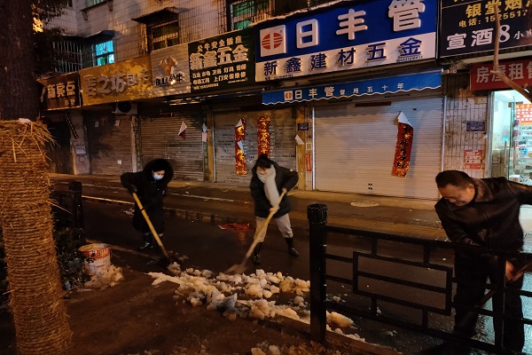 夜里氣溫低,大家團結協作、不畏嚴寒,有序的清理,各種清掃工具輪流出場。鐵鏟與地面的摩擦聲此起彼伏,奏響一首鏟雪除冰進行曲。所有人頂著寒風,鏟出一條又一條便民路、暖心路。保證了每一位居民的出行安全,引得路過群眾的紛紛點贊。