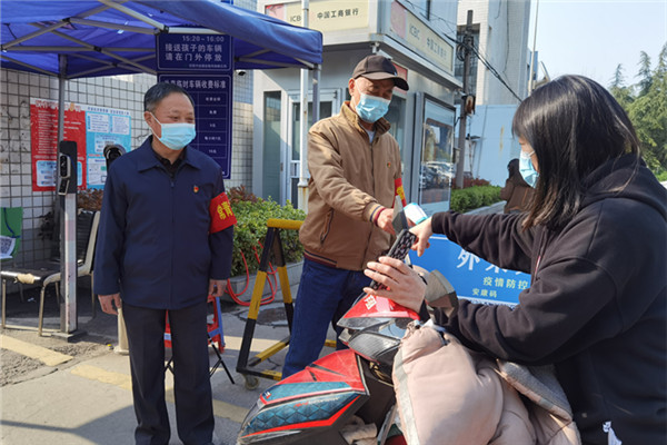 “姑娘,請配合測體溫,掃行程碼和安康碼再進小區。”近日,退休老黨員趙昌柱在江汽一村疫情防控點引導進出小區居民掃碼、測溫、佩戴口罩。