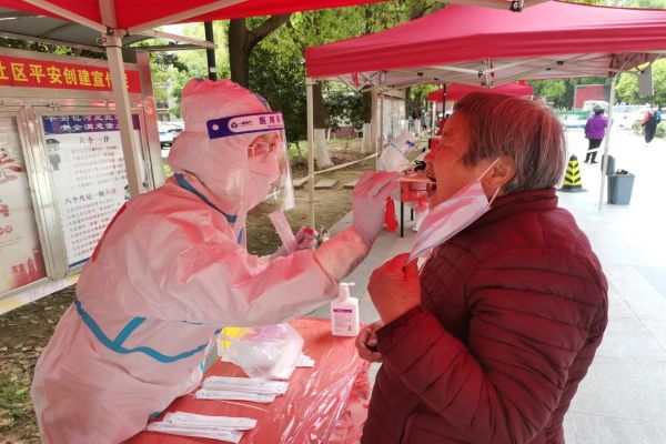 “大白”守護在一線。此次沿河社區共設置11個采樣點,11名醫護人員及22名黨員志愿者投身采樣一線,履職盡責,用實際行動詮釋初心使命。全體人員嚴格按照疫情防控要求,身著防護服、佩戴口罩、護目鏡、一次性手套等,登記、取管、消毒、采樣、封存……面對眾多待檢群眾,他們一遍遍嚴謹地重復著工作流程,確保核酸樣本采集工作安全有序進行。