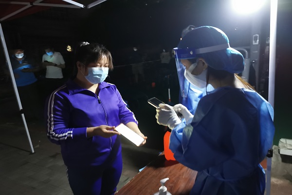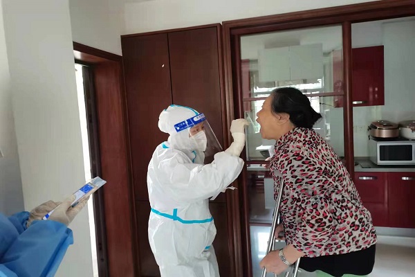 “您好,我媽媽腿摔著了,她不能下樓做核酸,能麻煩你們上樓去幫忙采集核酸么?”“好的,請(qǐng)稍微等下,我們把現(xiàn)場(chǎng)排隊(duì)等待做核酸的居民做好后,就上門給大媽采集核酸。”