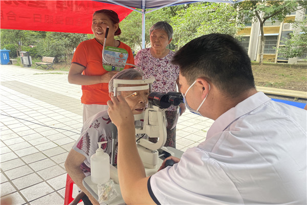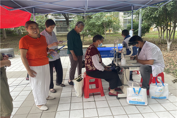 當天上午八點多,醫護志愿者很快擺好檢查的儀器,搭建了一個簡易的篩查服務點,很多居民便來到社區廣場排隊等待檢查。這邊眼科醫療服務隊對前來的每一個人都進行了視力的測量,針對老年人容易出現的眼科疾病,如白內障、青光眼、老花眼等進行檢查,檢查過后還有專門的人員對老人的檢查結果進行耐心解釋,并針對需要治療的過程進行簡單說明。針對老年人容易出現的眼科疾病,醫生還教授了如何預防眼病的方法。