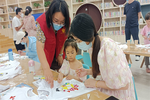 隨后,工作人員引領孩子和爸爸共同繪制親子T恤衫。小朋友們和家長發揮著自己天馬行空的想象力,細心勾勒著輪廓,認真填充著色彩,一個個生動形象的父親卡通模樣在小朋友的巧手下變得栩栩如生。在家長的陪伴守護下小朋友們共同度過了快樂的親子時光,也獲得了一件獨一無二的繽紛親子T恤。