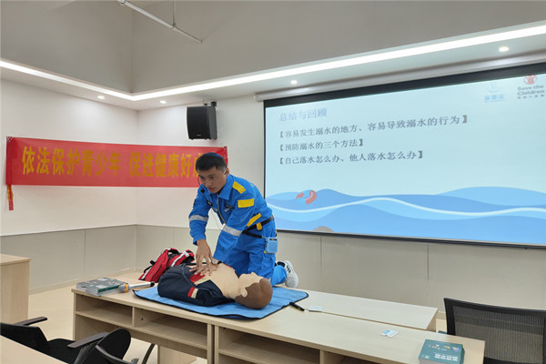 活動第二部分,老師首先通過圖文、視頻等形式結合溺水游戲,生動形象地向孩子們科普溺水的危險性和防溺水的方法。其次,老師教授孩子們在沒有救生衣的情況下,如何利用礦泉水瓶制作一個簡易的救生漂浮物。最后,老師向大家介紹了急救心肺復蘇方法,讓孩子們熟悉并掌握心肺復蘇的一個操作流程。利用多種形式讓孩子們掌握防溺水安全常識,增強安全防范意識,提升個人自救能力。